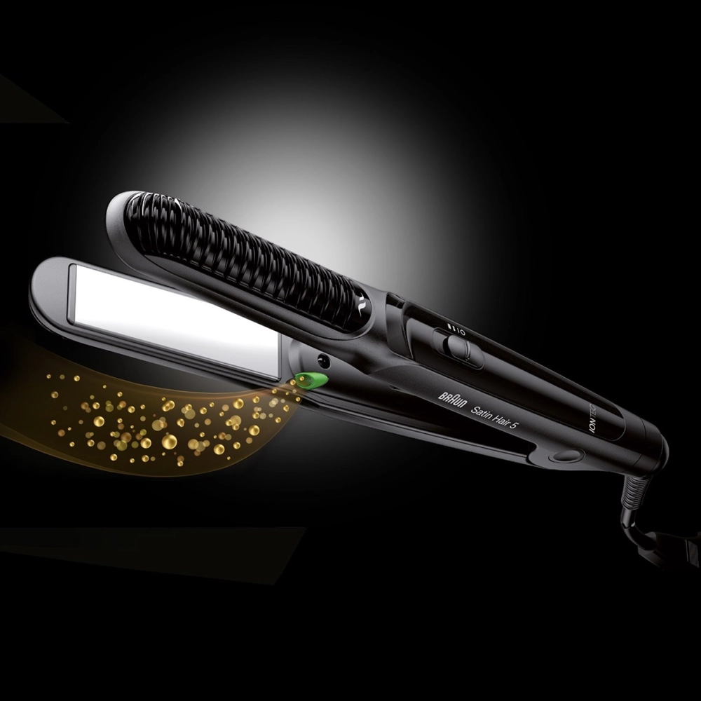 Мультистайлер Braun Satin Hair 5 с функцией ионизации IONTEC излучает миллионы активных ионов каждым движением. Они немедленно устраняют статическое электричество, выравнивают завитки и заметно усиливают блеск.