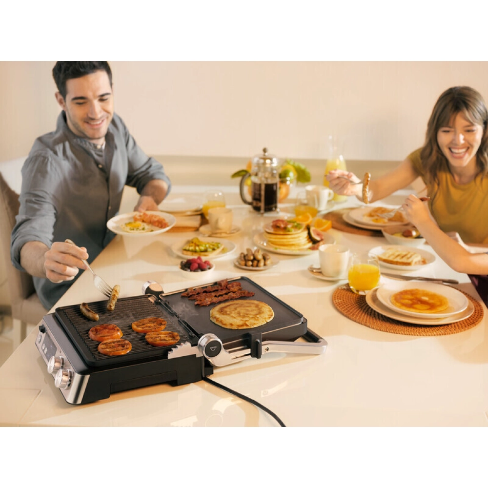 Два электронных термостата позволяют регулировать температуру каждой тарелки, что позволяет готовить два типа блюд при разных температурах одновременно. Например, вы можете жарить стейк и готовить овощи на гриле при разной температуре.