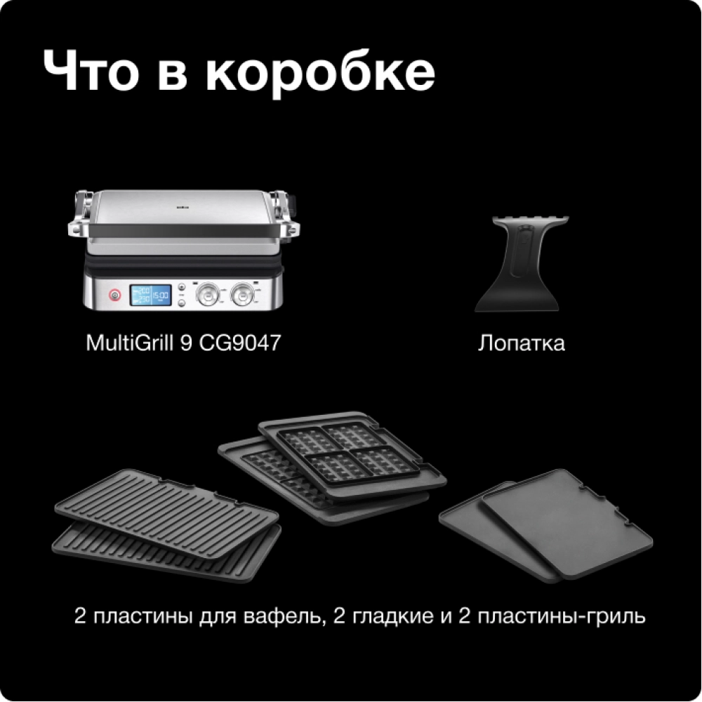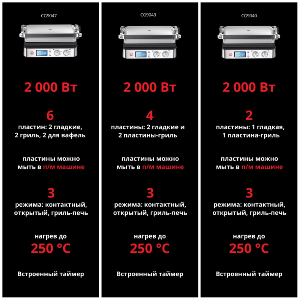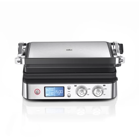 Электрогриль Braun CG9047 позволяет приготовить любые продукты: стейки, колбаски, гамбургеры, овощи или рыбу. Использование прибора простое и понятное: вся необходимая информация указана на дисплее. Эта модель работает в трех режимах: контактный гриль (с закрытой крышкой), открытая жаровня (крышка откинута) и «гриль-печь» (верхняя панель приподнята над нижней). Температура нагрева задается в диапазоне от 60 до 230 градусов отдельно для каждой поверхности при помощи поворотных регуляторов. Прибор оповестит о готовности к работе звуковым сигналом – пора приступать к закладке продуктов! Электрогриль оснащен нагревательными элементами с двух сторон, что обеспечивает равномерную прожарку блюд и румяную корочку. Наклон крышки можно регулировать.