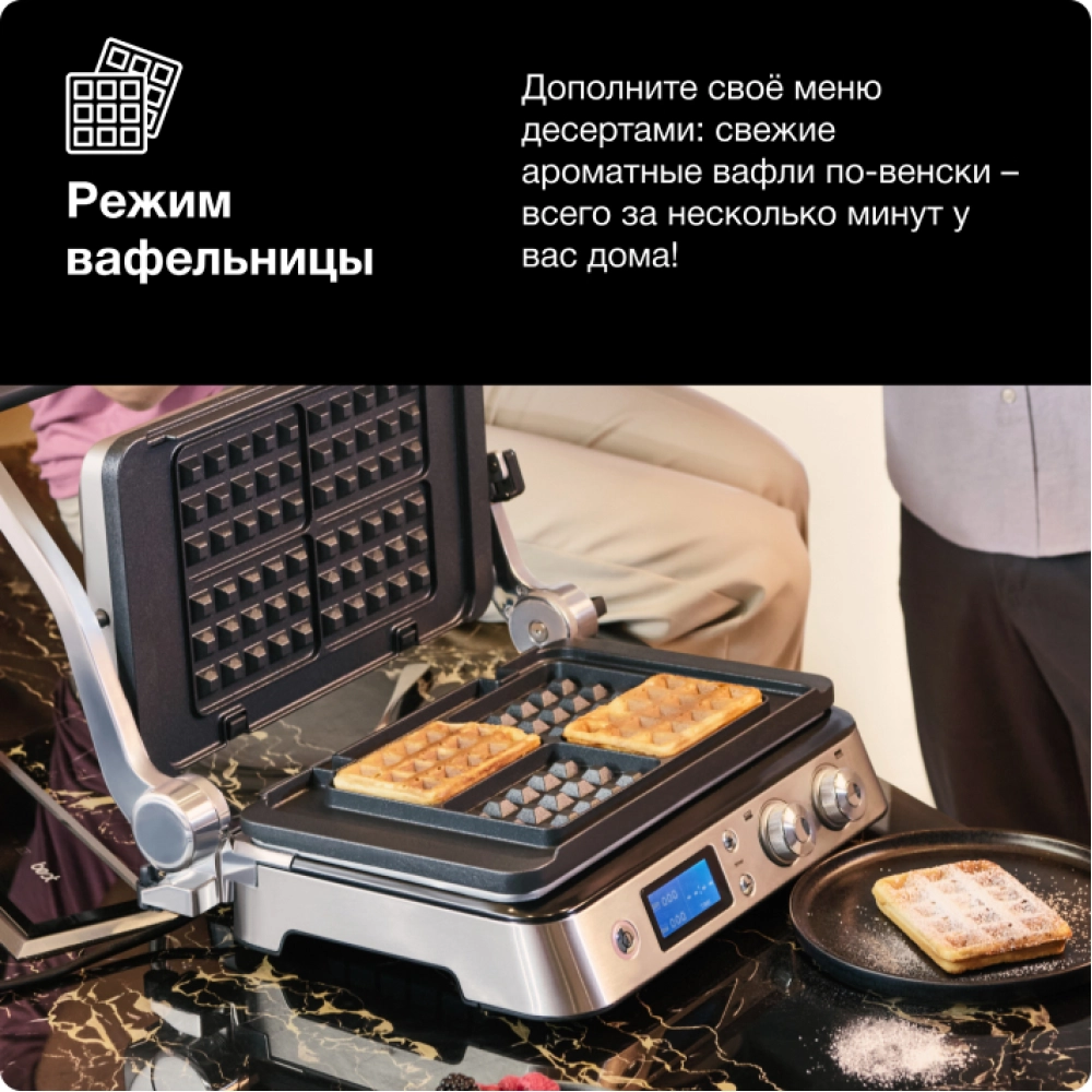 Функция "панини" поджаривает хлеб снаружи и разогревает сэндвичи внутри, а "гамбургер" делает идеальные бургеры. Заранее установленное время и температура обеспечивают беззаботные результаты, а функция поддержания тепла автоматически сохраняет еду горячей на уровне 60°C до подачи.