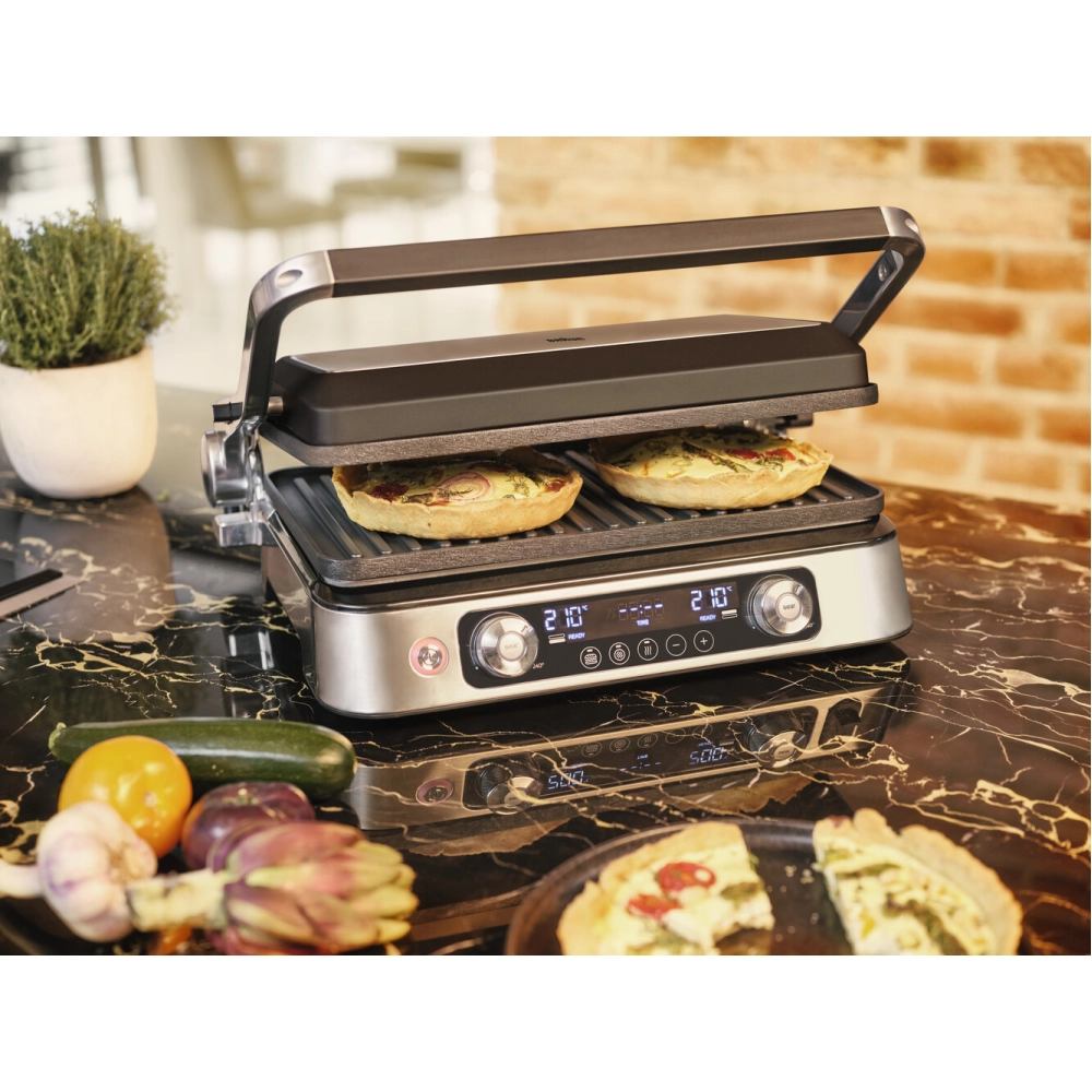 Функция "панини" поджаривает хлеб снаружи и разогревает сэндвичи внутри, а "гамбургер" делает идеальные бургеры. Заранее установленное время и температура обеспечивают беззаботные результаты, а функция поддержания тепла автоматически сохраняет еду горячей на уровне 60°C до подачи.