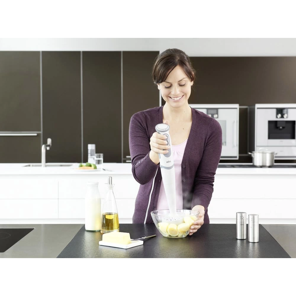 Блендер Braun Vario MQ 5035 WH Sauce не только поможет вам готовить ещё вкуснее, но также и украсит вашу кухню своим изысканным дизайном. Для этого блендера компаний Braun разработана специальная, более удобная ручка. А чтобы готовить можно было ещё быстрее – у вас на выбор будет 21 скорость. Мощность блендера составляет целые 750 Вт. Также к нему прилагаются насадка для создания теста, венчик для взбивания крема и специальный мерный стаканчик.