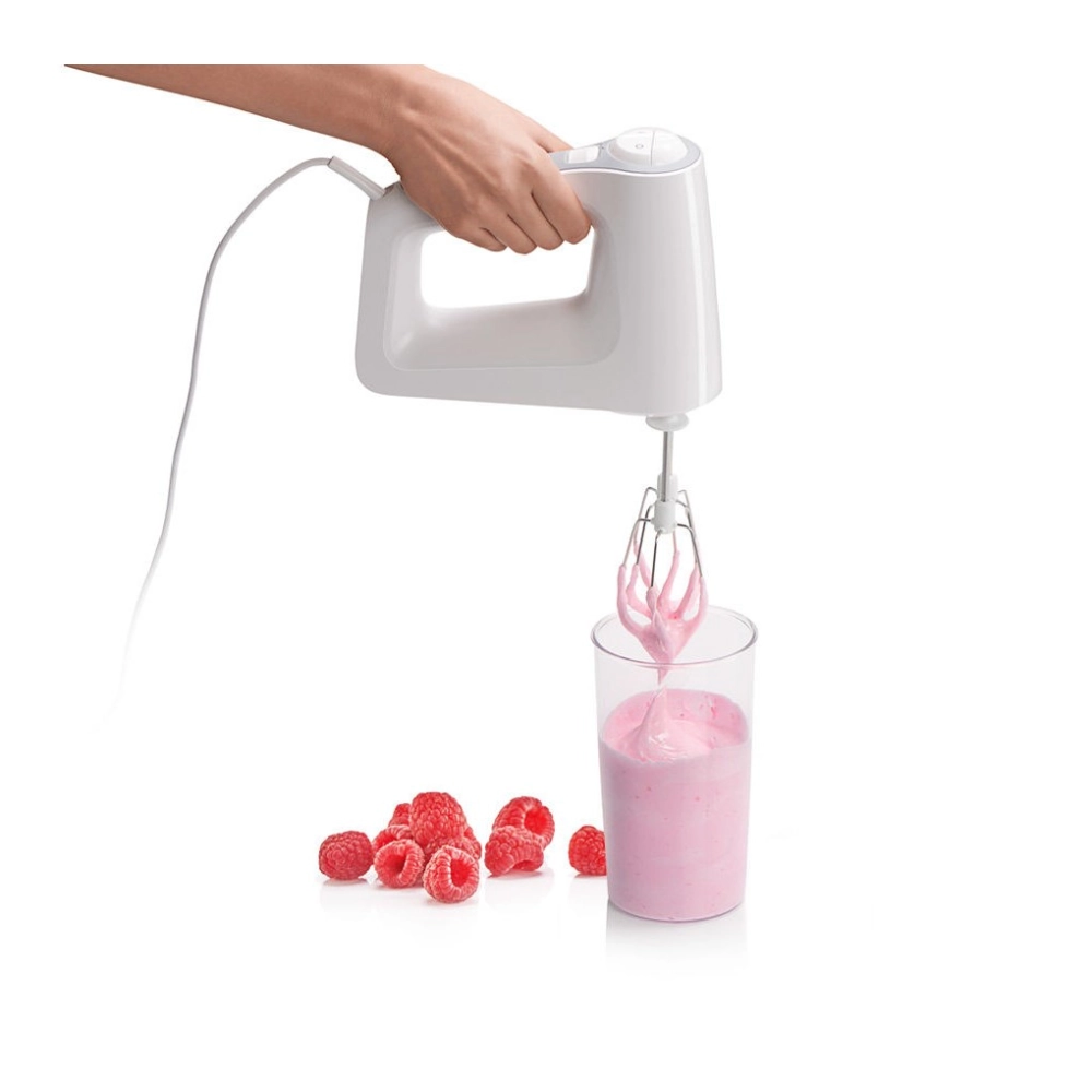 • В комплектацию, помимо двух прочных венчиков для взбивания и двух крюков для перемешивания теста, включены погружной блендер из нержавеющей стали и емкость для смешивания. Стальные насадки надежны и долговечны. Стакан изготовлен из высококачественного пластика и безопасен.