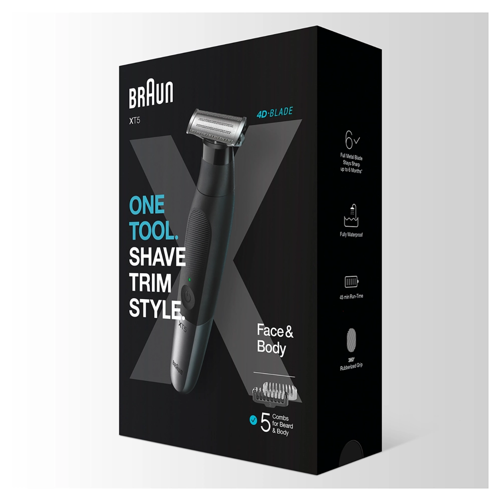 4D-лезвие имеет длительный срок службы, оставаясь острым до 6 месяцев*. Прибор оснащен двухсторонним гребнем, позволяющим легко и быстро подравнивать волосы движениями вверх или вниз. А благодаря 100%-ной водонепроницаемости Braun Series XT5 можно использовать любым способом и в любом месте — с пеной или гелем, над раковиной или в душе.
