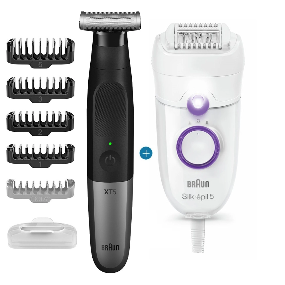 Набор: Триммер электрический Braun OneTool XT5100 черный/серебристый + Эпилятор Braun Silk-epil 5 Series 5-505P White Purple