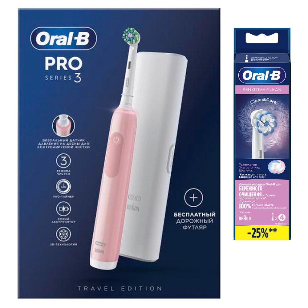Электрическая зубная щетка Oral-B Pro 3 3500 + Насадка для бережной чистки Oral-B Sensitive Clean (4 шт)