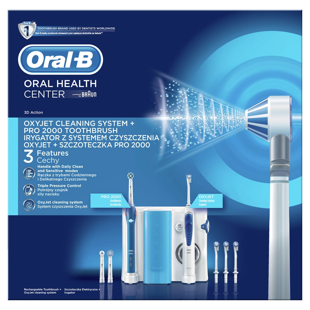 зубная щетка Oral-B PRO2000, ирригатор OxyJet, насадок для щетки - 3, насадок для ирригатора - 4, зубной центр, комплект для крепления к стене