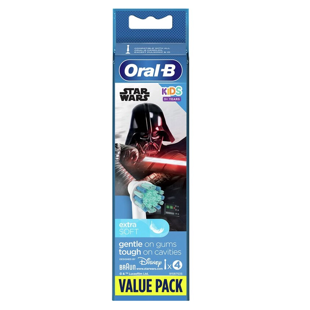 Сменная насадка для зубных щеток ORAL-B Kids Stages. Насадки для электрической зубной щетки Oral-B Stages Power с изображениями героев c изображениями героев фильма «Звездные войны» специально разработаны для детей, чтобы процесс чистки зубов приносил им радость, улучшая здоровье полости рта. Сверхмягкие щетинки не травмируют нежные десны. Укороченные щетинки обеспечивают бережное удаление зубного налета, а более длинные центральные щетинки идеально подходят для очищения жевательных поверхностей зубов. Превосходный выбор для развивающейся полости рта вашего подрастающего героя.. Рекомендуется малышам до 3-х лет под присмотром родителей. Подходит ко всем электрическим зубным щеткам Oral-B, кроме звуковых электрических зубных щеток Oral-B Sonic/Pulsonic.