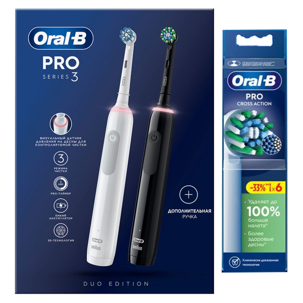 Набор электрических зубных щеток Oral-B Pro 3 Black and White (2 шт) + Насадки для эффективной чистки Oral-B CrossAction (6 шт)
