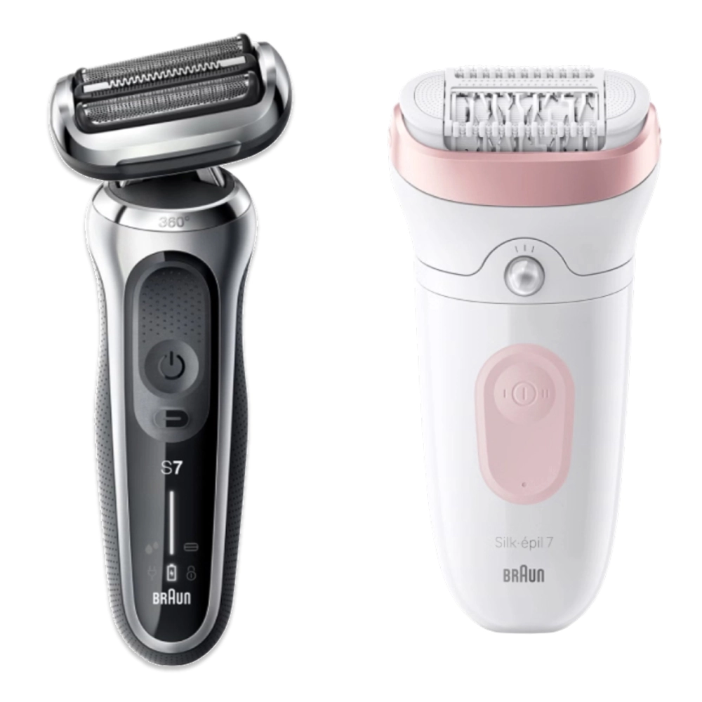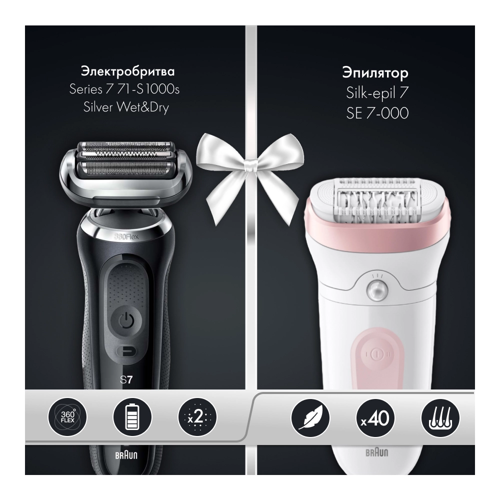 - Набор: Электробритва Braun Series 7 71-S1000s Silver Wet&Dry 360° + Эпилятор Braun Silk-epil 7 SE 7-000