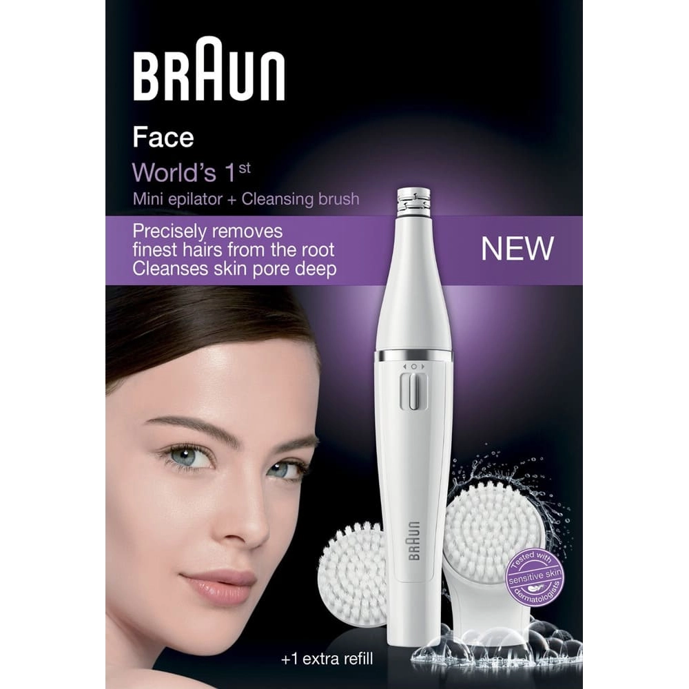 Деликатно восстанавливает удивительную чистоту и сияние кожи лица, удаляя макияж и загрязнения. Сотни микровибраций щеточки для очищения лица Braun Face обеспечивают результат в 6 раз лучше очищения вручную, а также мягко отшелушивают и совершенствуют кожу. Эпилятор для лица Braun Face не только восстанавливает свежесть и сияние кожи лица. Он также усиливает эффективность действия кремов и увлажняющих средств.Глубоко очищает поры